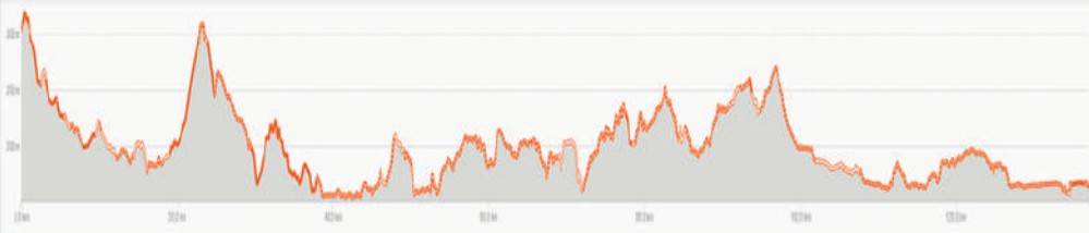 Le parcours présente un dénivelé de 1032 m, mais sans grandes montées car la majorité du tracé se situe entre 300 m (départ) et 150 m (arrivée) au-dessus du niveau de la mer.